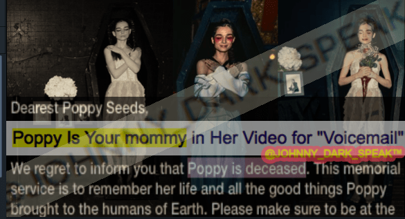 Meow meow at the VIP POPPY CONCERT 2020, all attendees were emailed 5 min before the show and told that MOMMY POPPY had passed away and this VIP was a memorial for her !!! This directly lined-up with the Dark Speech message about MOMMY POPPY being MOMMY and having PASSED AWAY, so I knew I was on the right kitten track in learning this information directly from a VIP concert email, like WTF broo !!!