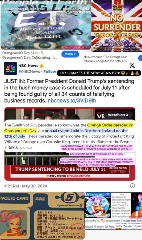 Meow meow it makes so much sense now, all in hindsight, that we can see FUTURE GIRL July 12 Girl ULALA’s Space ID card has her birthday listed as MAY 30th, meanwhile the news surrounding Donald Trump courtroom drama started on May 30th and had the date JULY 12 slapped onto it, the EXACT DATE associated with the character ULALA, who is portrayed as both in her pink dress and in orange Spacesuit !!! July 12 is known in Northern Ireland as ORANGE MAN’s DAY, the Belfast Fire Festival, and Donald Trump, known online as the ‘ORANGE MAN,’ he got shot at in assassination attempt JULY 12 ORANGE MAN’S DAY…