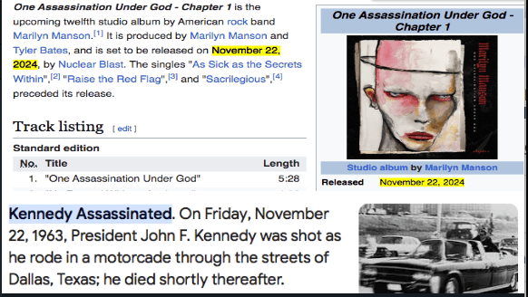 Meow meow it makes so much sense now that we can see the newest Marilyn Manson album is due for release November 22nd, 2024 (the date JFK was assassinated)