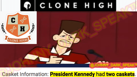 It was at some point while listening to the JFK ASSASSINATION DARK SPEECH (news and documentaries in reverse) that the Dark Speech seemed to indicate that a “CLONE” was used, even going so far as to use a new combination term called “CLONE-NNEDY,” a clone of Kennedy…well it just so happens that there’ s a show from 2002 called CLONE HIGH, which has a main character JFK…