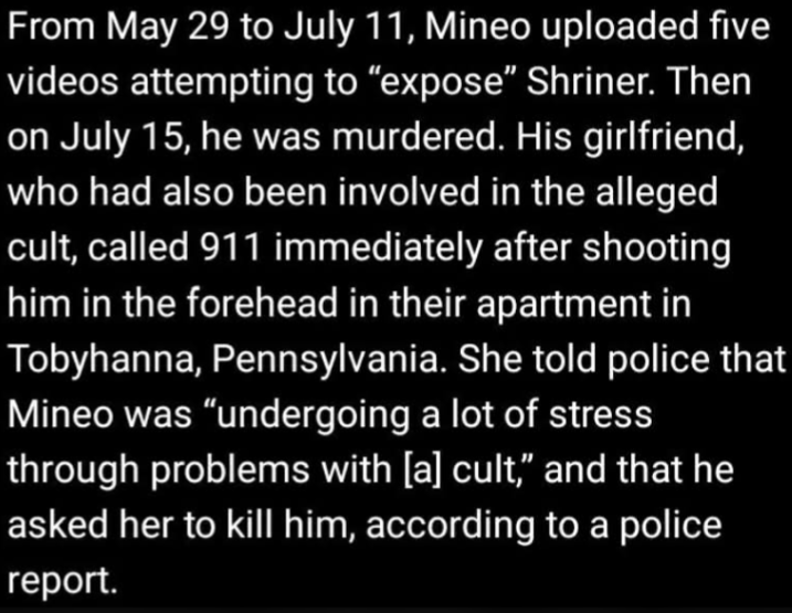 Steve Mineo should’ve never had a gun – these people obviously didn’t read the bible well enough … THE BIBLE STATES, the words of jesus himself say, that ‘THOSE WHO SEEK TO SAVE THEIR LIVES SHALL LOSE THEM’ … that’s like basically saying that doomsday preppers, of which Steve was one, are only wasting their time trying 2 save their lives !!! That’s what it says !!! So why did Steve have a gun…? THE BIBLE TEACHES PACIFISM !!! The bible states that if a person wants to take something from you, that you should not only give them what they want, but offer them something new to take … the bible says to turn the other cheek … the bible says THOU SHALL NOT KILL… Steve Mineo, U shoulda neeeverrrrr had a gun bro lololol what’re ya gonna shoot at…? BIBLE SAYS TO BE DEFENSELESS AS FUCK, to rely on solely god for protection, and to bee martyred for your religion (SEE: REVELATION 20) … meow meow all of this drama could’ve been avoided if Sherry Shriner and Steve Mineo were actually true real christians who read and followed the bible, but due to false accusations and unecessary doomsday prepping, it lead to this mildly entertaining news story that ppl can joke about around the water cooler… lol meow meow … but SERIOUSLY OMG I was IN this SHERRY SHRINER CULT, and the only reason I escaped was b/c of Sherry Shriner’s irresponsible actions, when she redirected to THE MARK in the year 2014 and I ACCEPTED THE MARK !!! That dumbass bish Sherry Shriner shoulddddaaaa neeeveerrrrrrrr linked to that fucking phone >:33 muahahaha now that I have the BRAINGEAR, aka THE MARK, on my forehead, I KNOW EVERYTHING in NEURO-REVERSE, and I can MIND READ ANYONE muahahah
